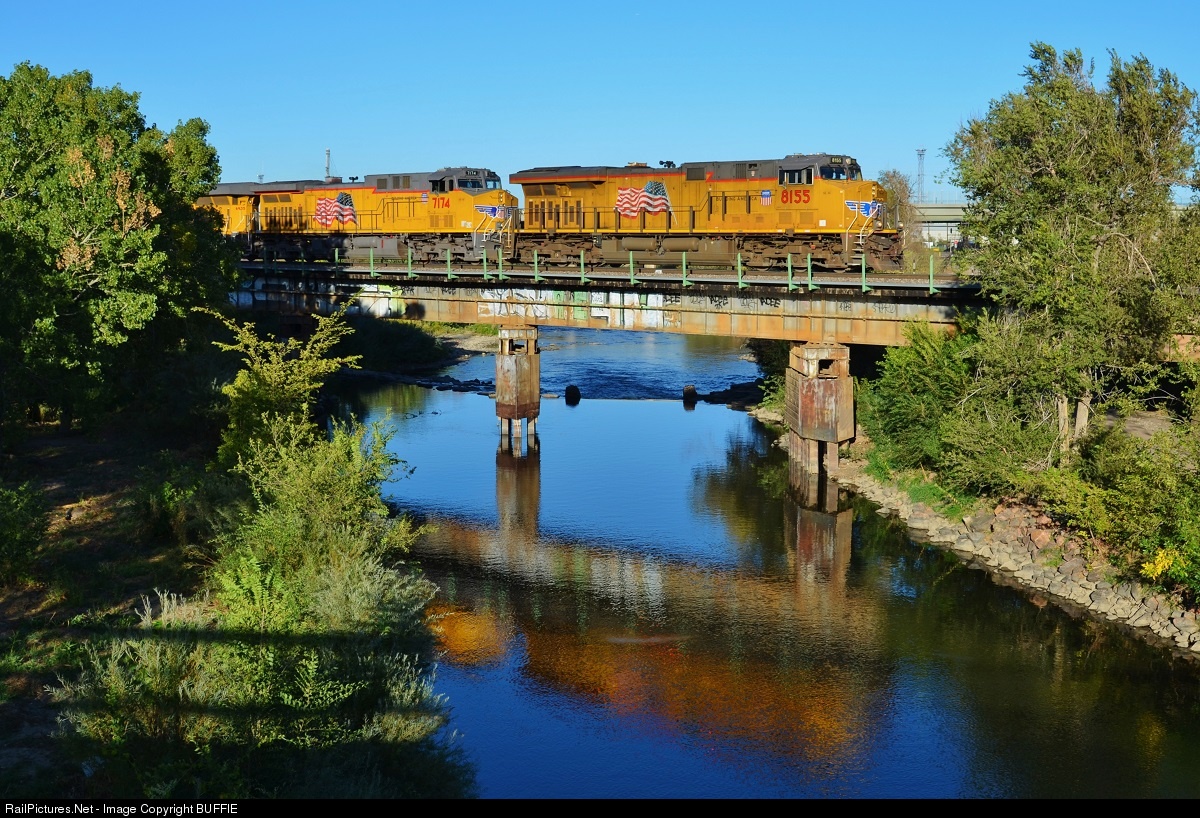 UP 8155 (ES44AC) leads a UP freight over the South Platte River and onto the Joint Line heading south of Denver.