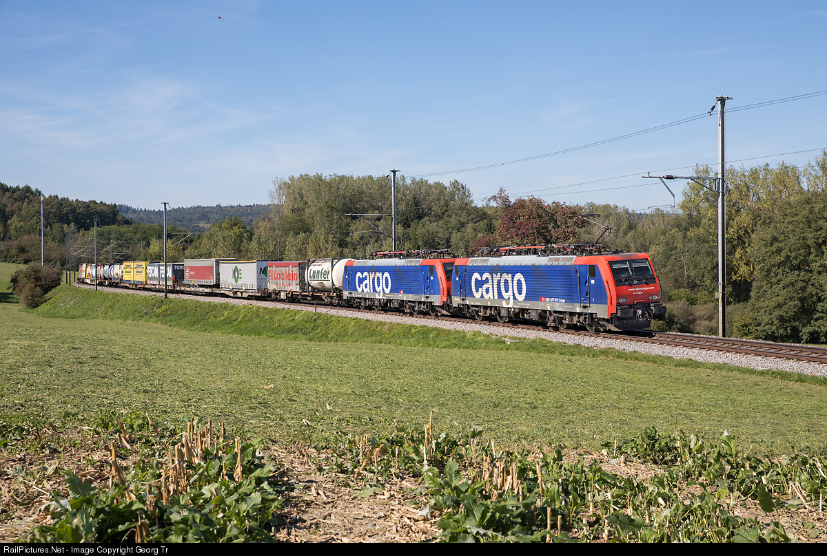 | Re 474 # 004 and # 005 of the SBB in multiple are pulling the diverted intermodal freight 40973 from Singen via Schaffhausen-Eglisau-Regensdorf-Bözberg to Basel shunting yard, this because of the line interruption of Rastatt for several weeks. |