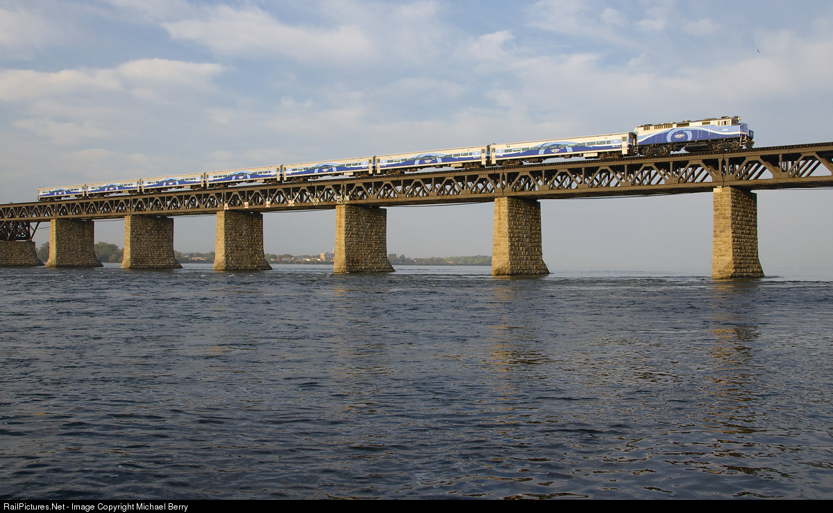 AMT 1342 leads a 7-car AMT 76 towards the island of Montreal on a humid morning.