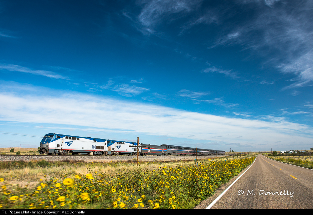 The Southwest Chief rolls along through scenic countryside at speed on its way to the next stop in Trinidad. Wild sunflowers line the road, and a lone house is passed in a very sparsely populated area.