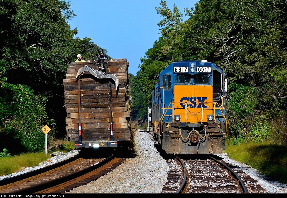 Looking odd at first sight, a huge pile of crossties come rolling down the mainline with a gentlemen seemingly perched on top of them... In actuality, a CSX MAC truck is traveling in reverse with this employee sitting in a crane that is attached to the truck. The truck is pushing a trailer that's loaded to the max with old ties and also the truck is loaded too. At this angle and with that much cargo, the truck is unable to be seen. Just yards away from unloading, the gentlemen waves as he passes by... Hanging around for a few days now, the (General Purpose) locomotive #6917 and two other EMDs start their morning basking in the sun.