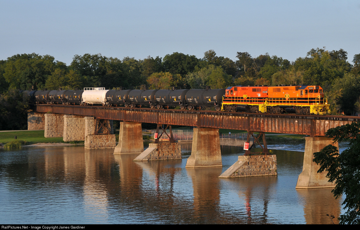 | QGRY 2301, and RLHH 2081 lead an early running Eastbound 597 with 58 tanks across the Grand River in Caledonia, ON |