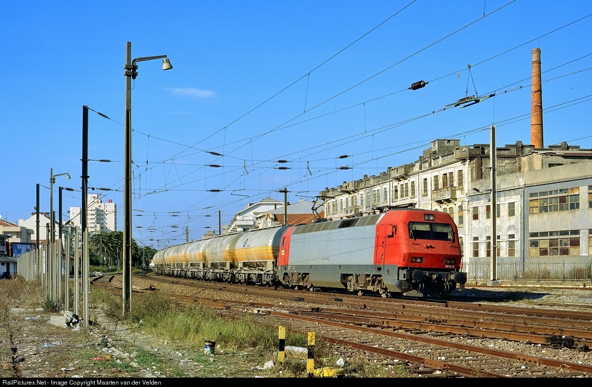 | CP 5616 passed Espinho with a southbound freight carrying cement. Nowadays the situation here has changed dramatically. The railway line lies in a tunnel under the city, the factory is changed in an apartment building and the palm trees in the background are vanished.