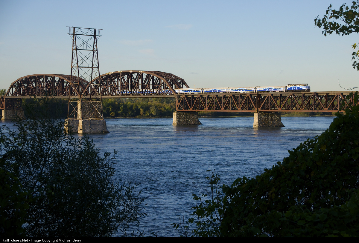 Ex-GO Transit F59PH AMT 1342 leads AMT 76 during the morning rush hour on CP's impressive bridge over the St. Lawrence River.