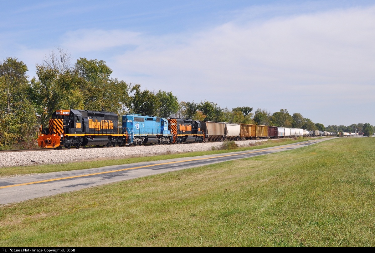 Wheeling 223 rolls west through Wellington with a recent rebuild leading two other SD40-2s. Just out of site at right the rear end is still coming across the Big Four diamond.