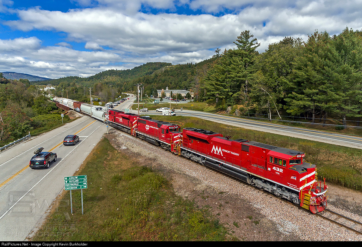 With the B & R Subdivision, between Rutland and Bennington, Vermont, being curfewed for bridgework, the opportunity arose to do some marketing and PR photos with both of the six axle Vermont Railway SD70M-2s… as the case has been, the pair cannot run directly back to back due to bridge weight restrictions. Having the right availability of 4-axle unit to split them with a red unit is often difficult. With good clear weather forecast, the time was ripe for the all reds to make the marketing and PR run on Sept 28 and 29. VTR SD70M-2s 432 and 431 bookend CLP GP40-2 306 as they cross Vermont Rt 103 at Proctorsville, VT.