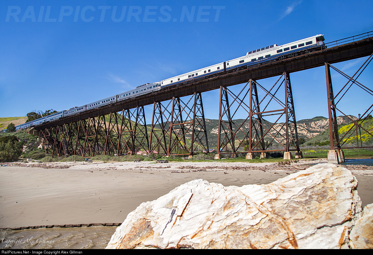 Skirting the California coast line high above the actual beach, five private cars bring up the markers of today's northbound Coast Starlight. Beginning from the end of the last Amtrak coach, the private cars "Silver Lariat," "Silver Rapids" and "Silver Solarium" all of California Zephyr fame look sharp as they round out the stainless steel consist. Following the "Solarium," the "Evelyn Henry" and "Warren R. Henry" bring up the markers as they cross the 811-foot long span that makes up the original Southern Pacific trestle here.