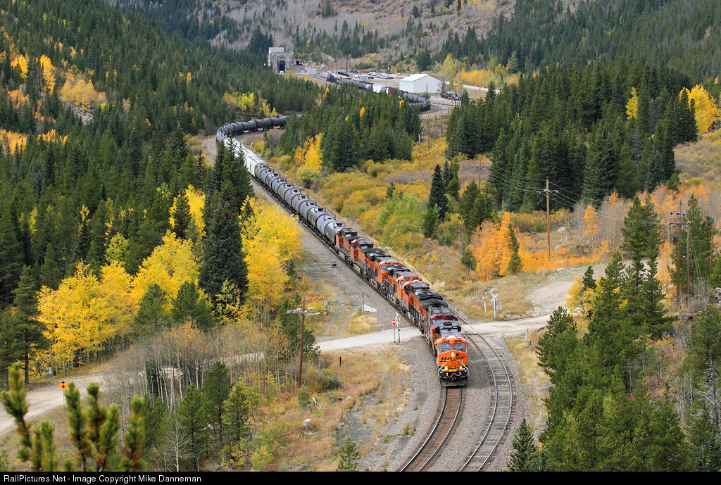 BNSF’s Provo to Denver manifest freight has just emerged from the 6.21 miles of darkness of Colorado’s Moffat Tunnel and is rolling eastward past East Portal siding and autumn’s beautiful colors on September 30, 2017.