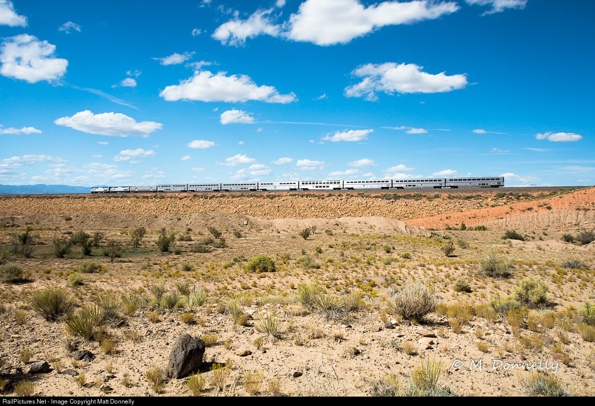 The Southwest Chief streaks across some scenic portions of desert on a fine afternoon.