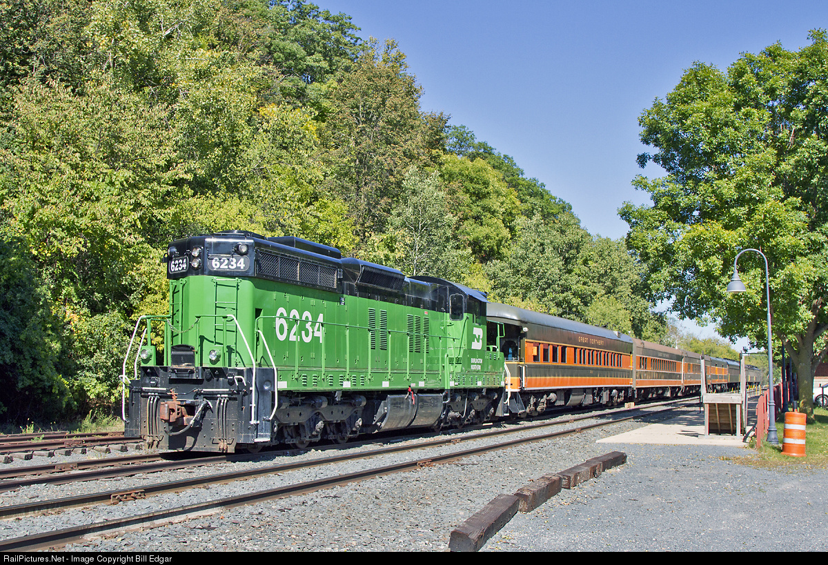 | Restored C&S SD9 BN 6234 basks in the sunlight at the former Soo Line station at Osceola, WI. Operated by the Minnesota Transportation Museum as the Osceola & St. Croix Valley Railway, excursion trains run in both directions out of the depot. The unit was built in April 1959 as C&S 839 painted in Burlington's red/gray scheme. |