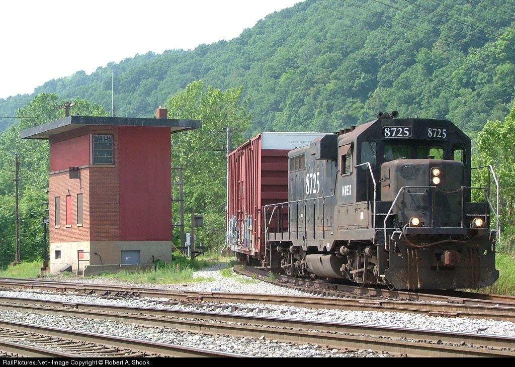 NREX 8725 shoving the Z685 onto SWP trackage @ Greene Jct. The former tower still stands.