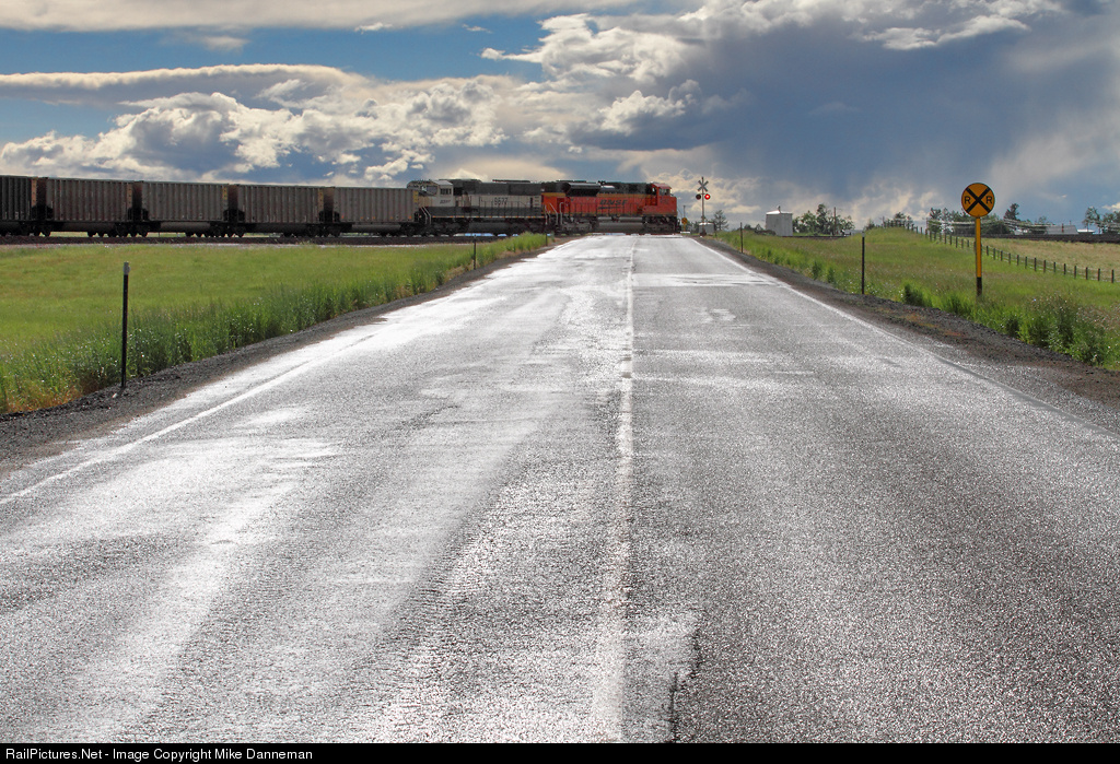 The pavement of Wyoming Highway 336 glistens in the afternoon sun after the passing of a brief rain shower as a BNSF coal empty curves through the wye at the connection of the Dutch Subdivision to the Big Horn Subdivision at Dutch on June 14, 2014. The Dutch Sub is a 30-mile branch to coal mines in Montana.