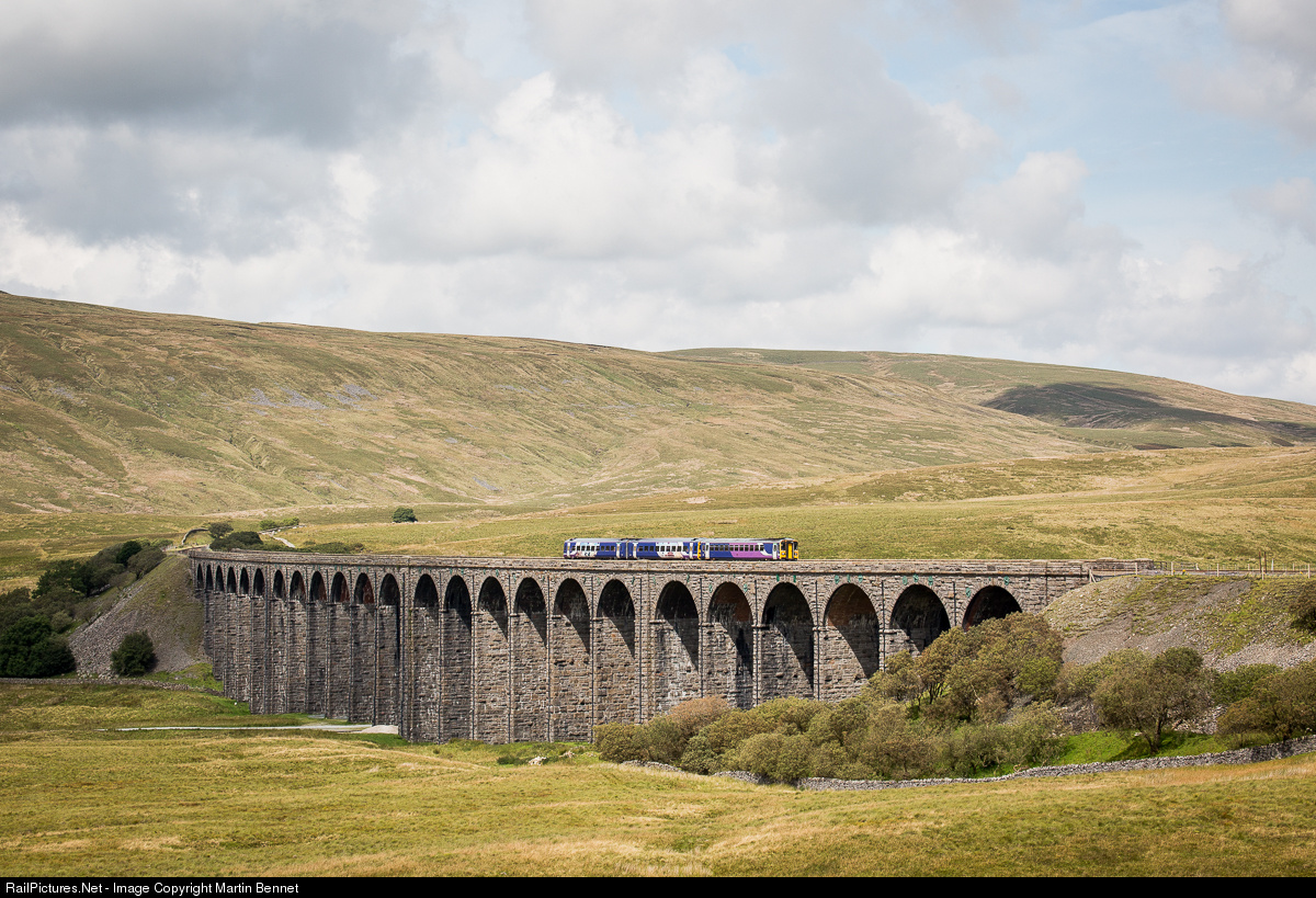 | A single Class 153 car leads a two car Class 158 over the Ribblehead Viaduct, on the Settle to Carlisle line. |