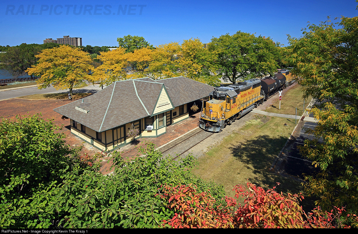 | UP local YBE51X is seen passing the depot at Rockford as it heads east about 4 miles to serve Rock Valley Oil & Chemical at what is now the end of the line. A couple other sections of the Kenosha Division are still in tact which include the 3.5 mile Chicago & Chemung Railroad into Harvard and UPs 4 mile Farm Sub between Bain and Kenosha. Here in Rockford, the UP local normally makes an appearance on Wednesdays. On Fridays and over the weekend, the Park District operates Trolley Car #36 over a couple miles of the railroad between the depot and Sinnissippi Park. |