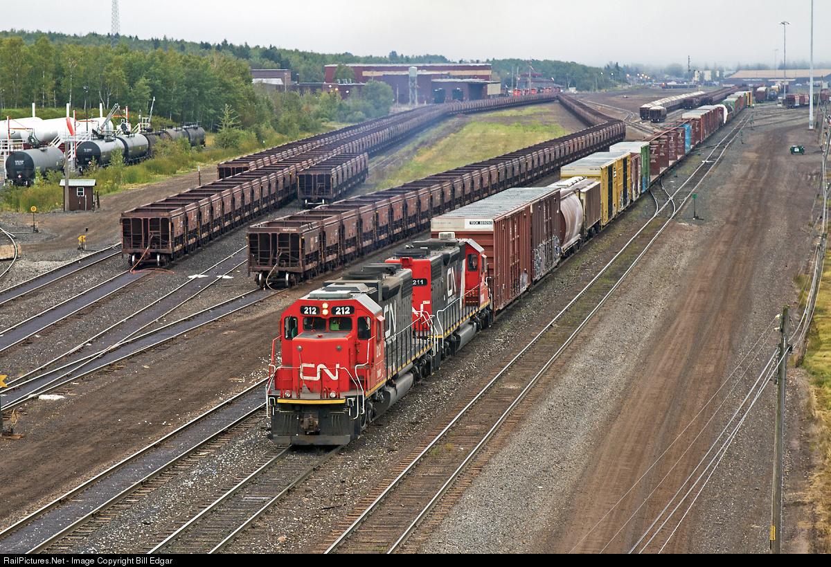 DMIR 212 and mate 211 handle switching chores for manifest freight at the west end of Proctor Yard. Painted in CN colors they still carry DMIR initials. Note the air hoses attached to the empty ore cars in the background. This allows air pressure to be set in the train before locomotives are attached.