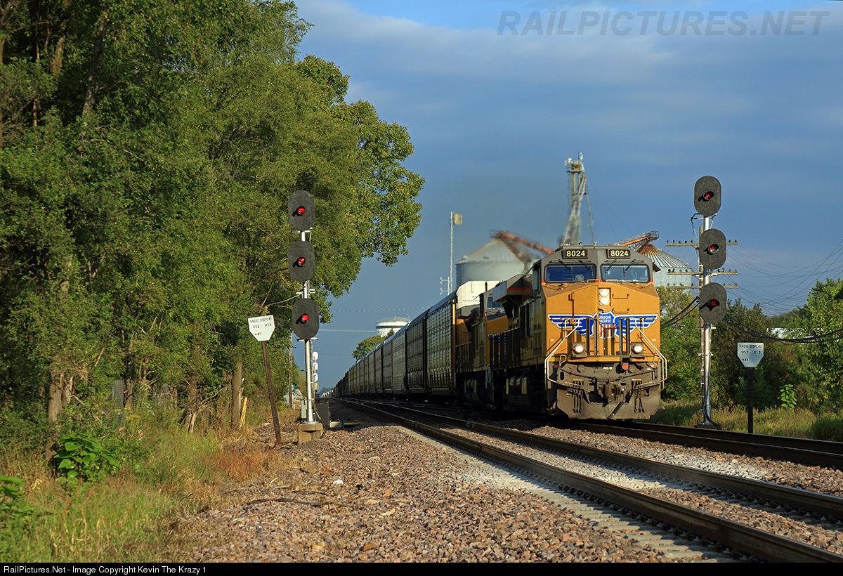 | UP 8024 leads a 210 car, 13227ft, 14889tn and 858 axle QPRNPV past the C&NW style search lights at Cortland. |