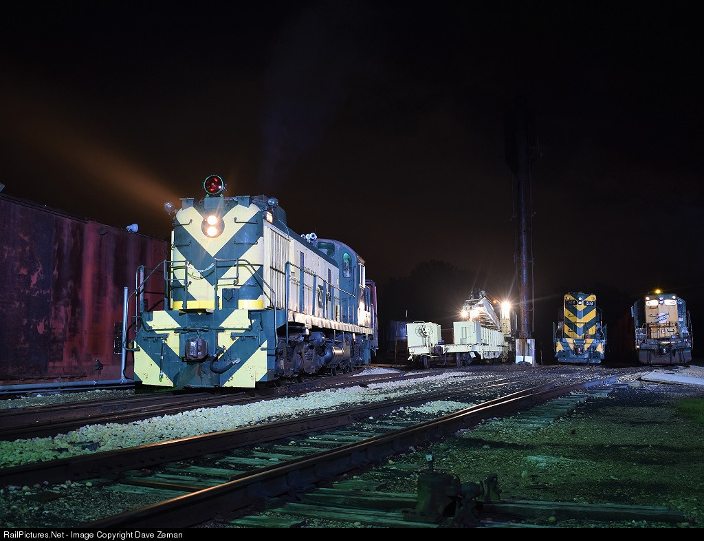 CNW 1689 stands at the focal point of a CNW night photo session among a CNW crane and a pair of high-hood GP units.