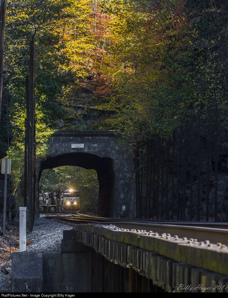 Westbound autorack 27V is about to pass through the short Big Four #2 Tunnel, with an SD60E leading the way. The fall colors are starting to show on the hill above the tunnel portal, although still patchy.