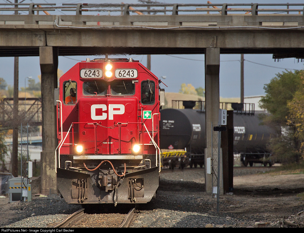 Having just exited the BNSF line at the diamond, a former Soo Line SD60 is on the point of the CP-BNSF transfer as it reverses eastward around the S-curve near the Amtrak station in Minot.