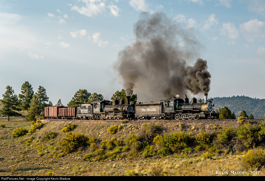 Late Afternoon Eastbound. A pair of elderly Rio Grande Southern Locomotives hustle a heavy freight east toward Durango in the fading afternoon sun. In this 2017 re-creation, our power line-up is led by D&RGW #315, an 1895-era C-18 Consolidation, which as far as we know, never ran on the "Southern", although some of her close sisters certainly did. Behind 315 is D&RGW #463, which on this day was masquerading as #455 in RGS paint. The 463 actually did do some running on the RGS as a loaner locomotive. This image was shot in the late afternoon on the curve just below Big Horn Peak, at around MP 299.6 on the present-day Cumbres & Toltec Scenic Railroad.