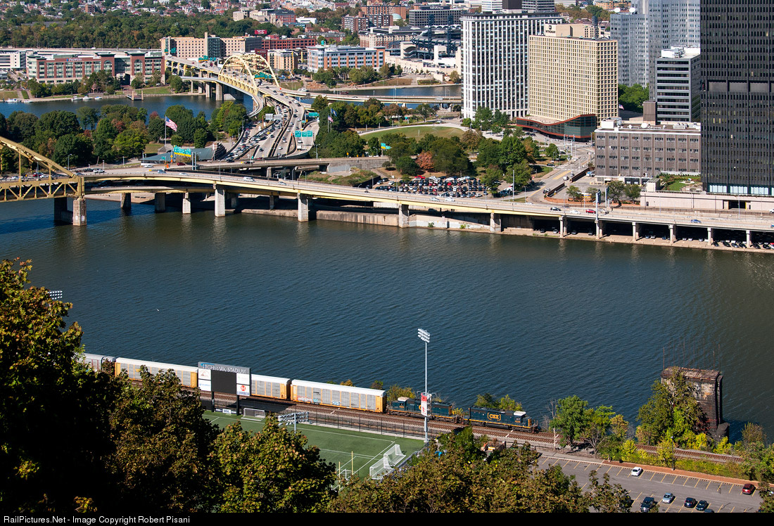 An eastbound CSX auto-rack train approaches Station Square with Pittsburgh's Golden Triangle providing a backdrop.