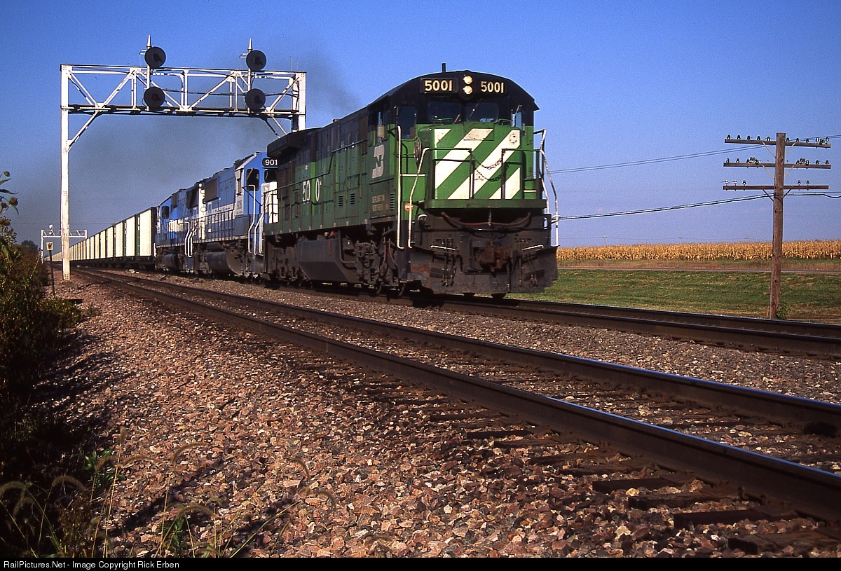 BN 5001 with a couple Oakway SD60s hustles empty hoppers beneath the CB&Q-style signal bridge near Greenwood, NE. Coal trains were commonplace at the time and there has been a startling downturn in their volume over the past few years following great expenditures to enhance capacity for their apparently brief prevalence. Fuji Velvia.