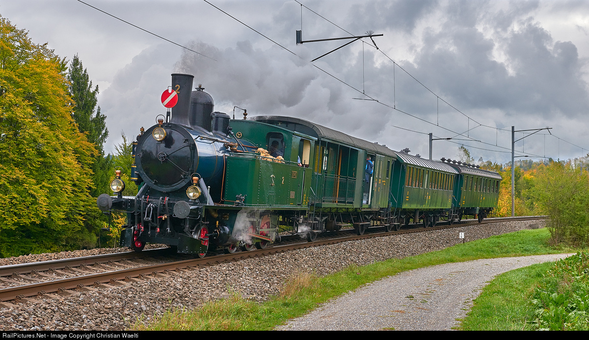 | Dampfbahn-Verein Zürcher Oberland (DVZO) 2-6-0 steam locomotive Ed 3/4 No. 2 "Hinwil" on the second leg en route from Bauma to the "Huttwiler Dampftage" (Huttwil Steam Days) in Huttwil, running as passenger extra 30120 from Hinwil to Wettingen. |
