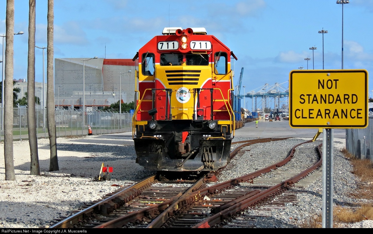 A beautiful day in downtown Miami sees the Florida East Coast Railroad "Port Job" shoving a cut of cars past the palm trees and back into the Port of Miami Terminal.
