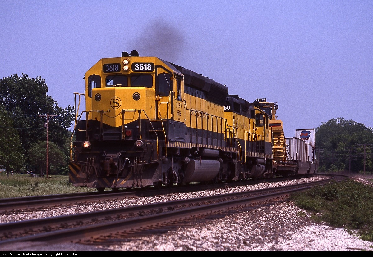 Back on home rails: NYSW SD45 No. 3618 was formerly BN No. 6500 and is seen here in the company of TPW 2050, an SD20u of Santa Fe heritage. They present a rather unusual power lineup on old BN No. 61, the Chicago-Denver intermodal, cruising through the countryside east of Lincoln, NE. Fuji Astia.