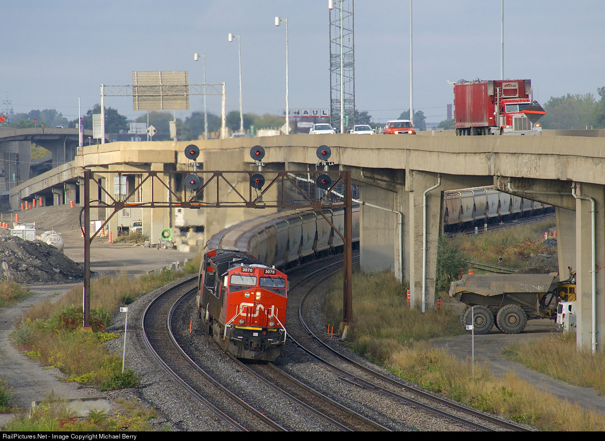 | CN B730 is leaving Turcot West after getting a new crew to take it to Joffre Yard. This heavy and lengthy 205-car train has four GE units for power, with CN 3070 & CN 3112 up front, CN 3062 mid-train and CN 2965 bringing up the rear. |
