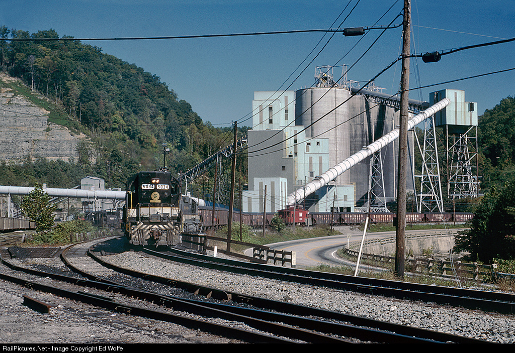 After loading 75 "yellow balls" at Holton, located off the ex-Southern's St. Charles Branch, the crew has set its cab off on the main line and is shoving the yellow balls in the load tracks at Westmoreland's Appalachia transloader. In the left-center background, another crew appears to be gathering empties. At the far left, a cut of Silversides awaits loading. At this point, activity at the transloader was quite brisk as Westmoreland's bankruptcy and closure of the transloader was 7-8 years in the future
