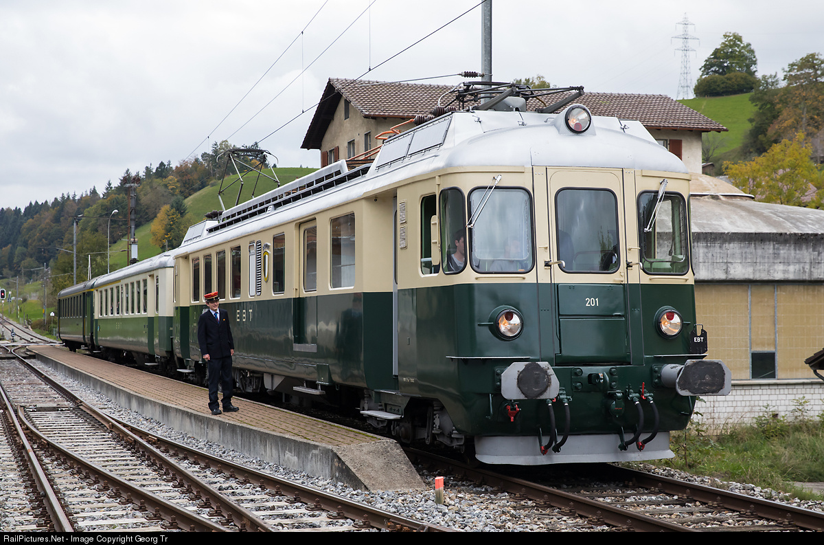 Electric railcar BDe 4/4 II # 201 (94 85 7 576 054-1) with cab car ABt 202 of association Pendelzug Mirage (VPM) at Dürrenroth on the line Sumiswald-Huttwil of Verein Emmentalbahn (ETB). The push pull train has the former BLS first class standard car A 801 of association Extrazug.ch in tow.