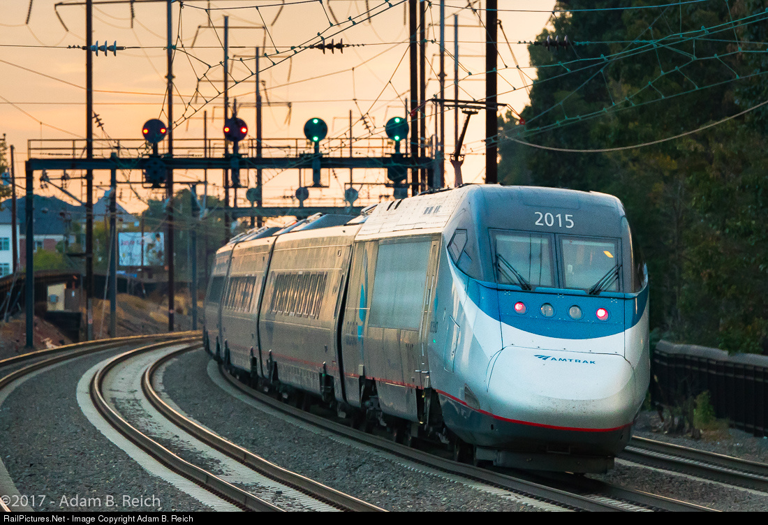 | Acela in the Morning Light: Acela Express Train 2150 rounds the curve at the east end of Metropark Station on Thursday, October 5, 2017. |