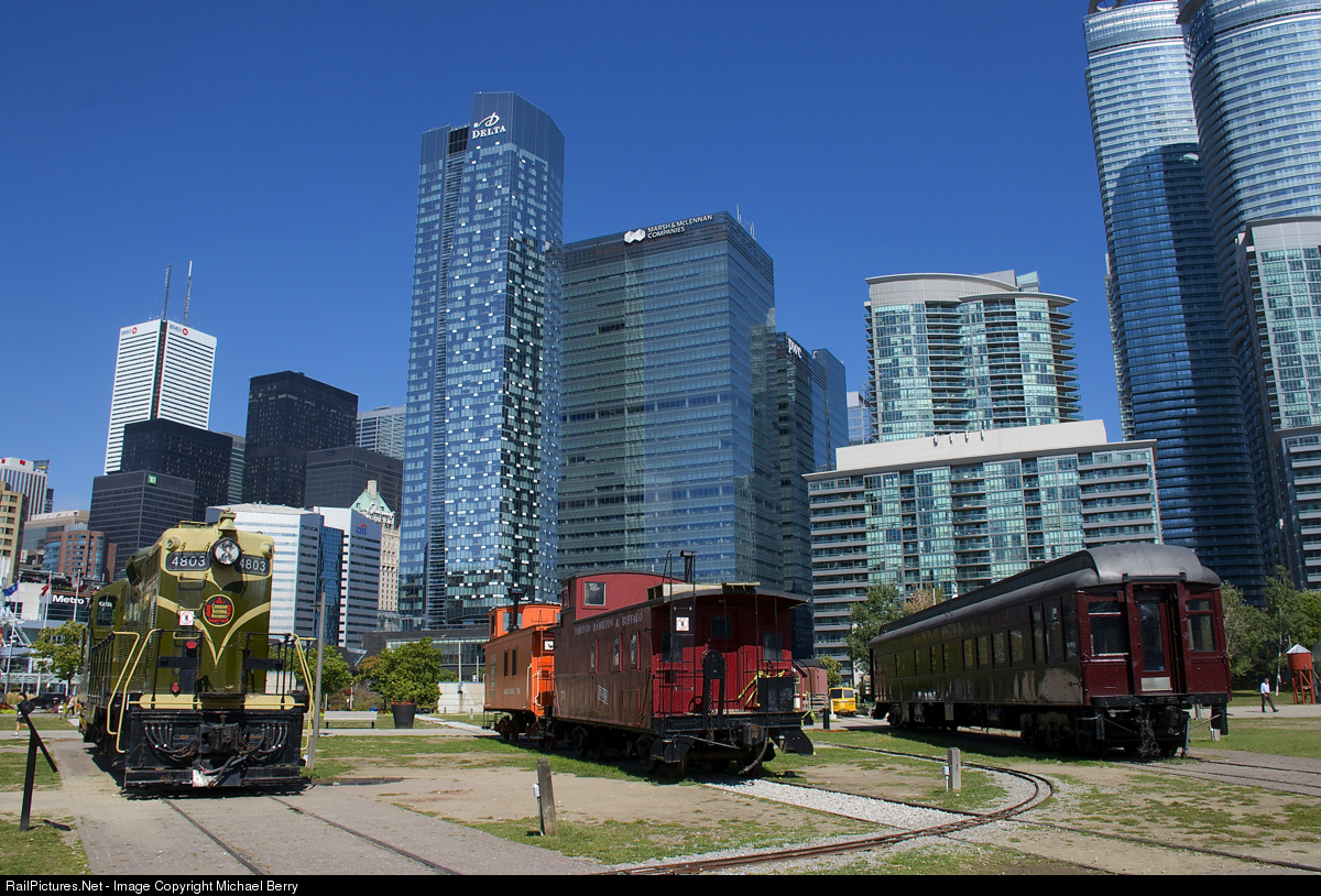 A GP7, some cabooses and a solarium car. GP7 CN 4803, cabooses THB 70 & CN 79144 and solarium car Cape Race are seen among the many skyscrapers and condos of downtown Toronto. In between the cabooses and the car are the rails of the mini-train which runs in Roundhouse Park.