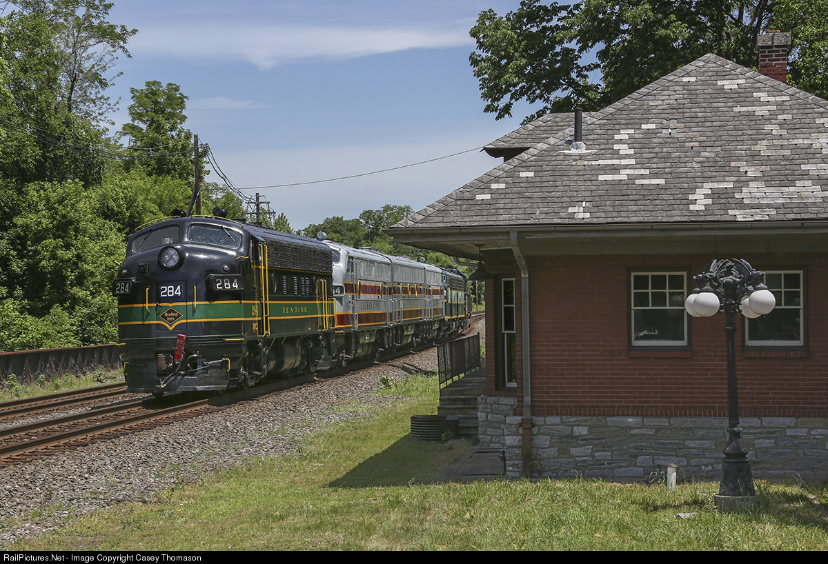Reading 284 brings up the rear of a locomotive move, passing the Swatara, PA, Reading RR depot. The units were returning to their homes after the "Streamliners" event at the North Carolina Transportation Museum in Spencer.