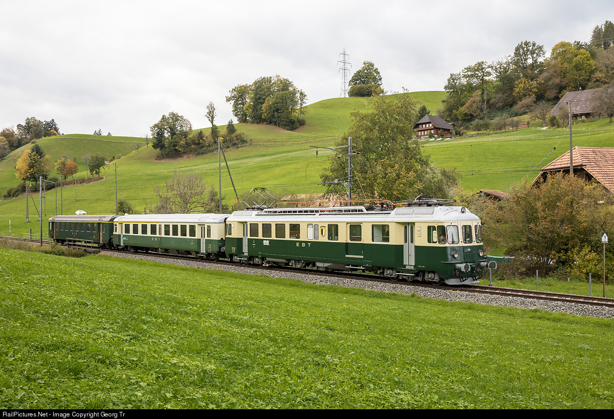 Electric railcar BDe 4/4 II # 201 (94 85 7 576 054-1) with cab car ABt 202 of association Pendelzug Mirage (VPM) at Dürrenroth on the line Sumiswald-Huttwil of Verein Emmentalbahn (ETB). The push pull train has the former BLS first class standard car A 801 of association Extrazug.ch in tow.