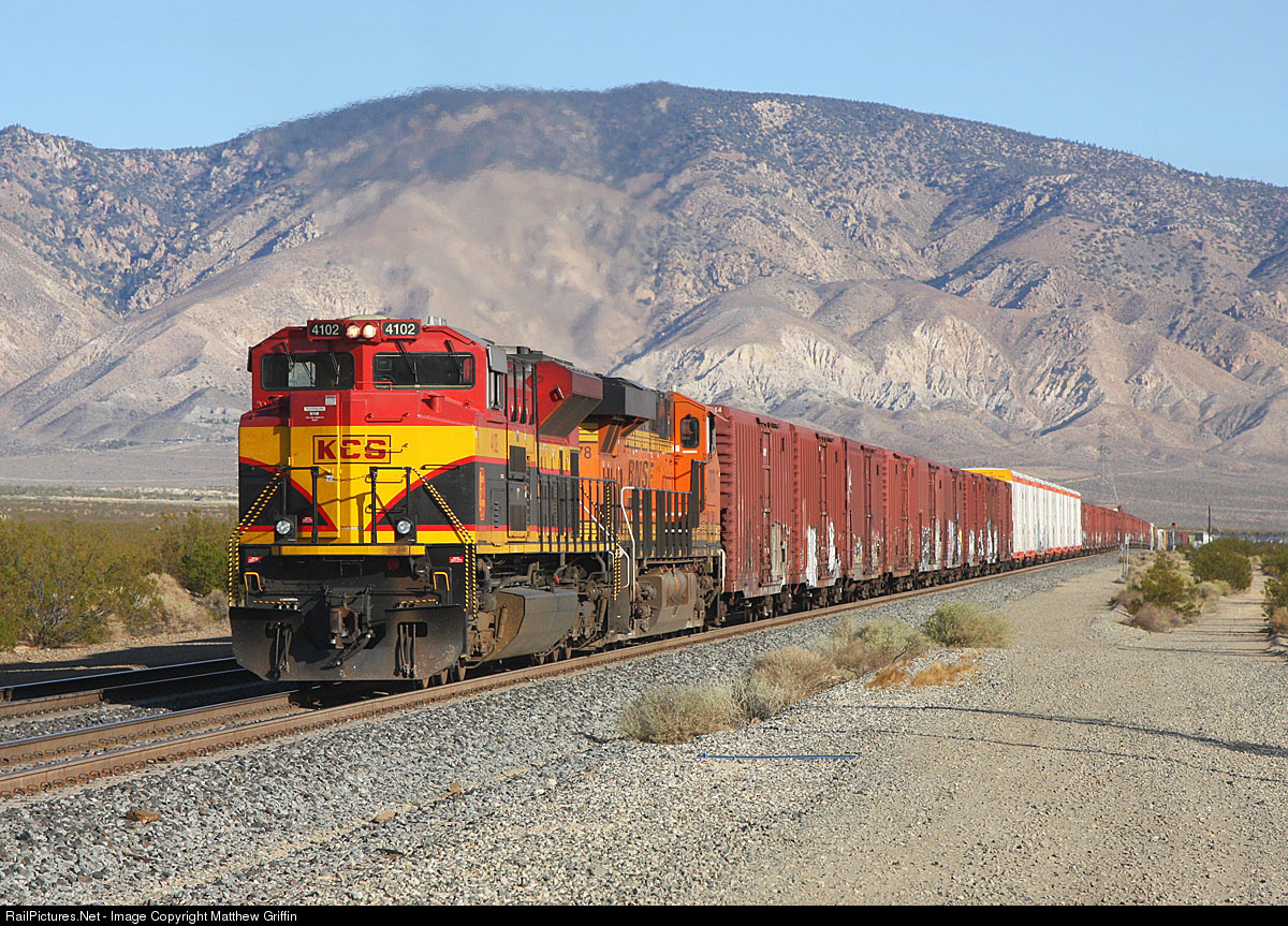 | Just north of Mojave, the speed of this HBARRIC has already dropped by half as it tackles the steep grade on the east side of Tehachapi Pass, with the help of KCS 4102 shoving on the rear. |