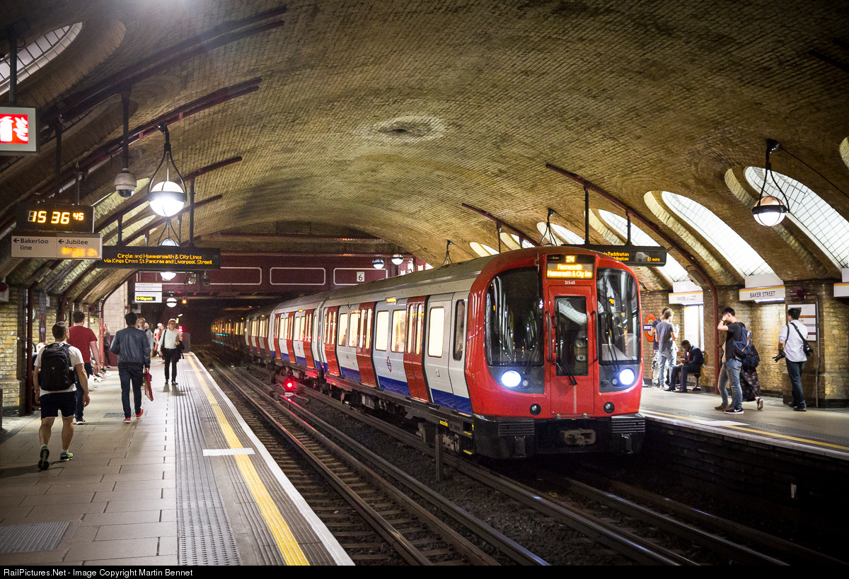 | A train of 'S stock' pulls into the original platforms at Baker Street, which opened in 1863 as part of the world's first underground railway. Baker Street is also well known as the home of the world's favorite fictional detective, Sherlock Holmes. |