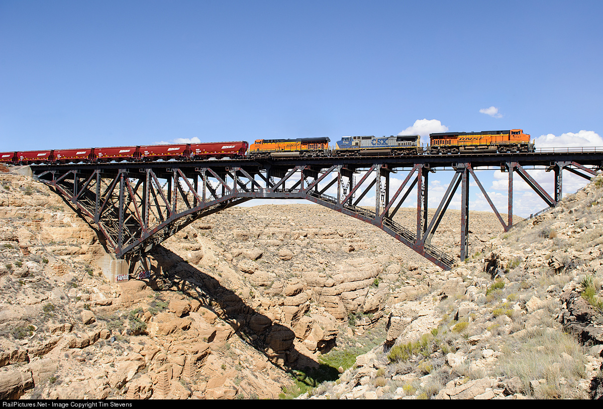 BNSF ES44C4 6747, CSXT C40-8W 7722 and BNSF ET44C4 3802 lead an empty grain train consisting almost entirely of brand new BNSF hoppers over the Canyon Diablo.