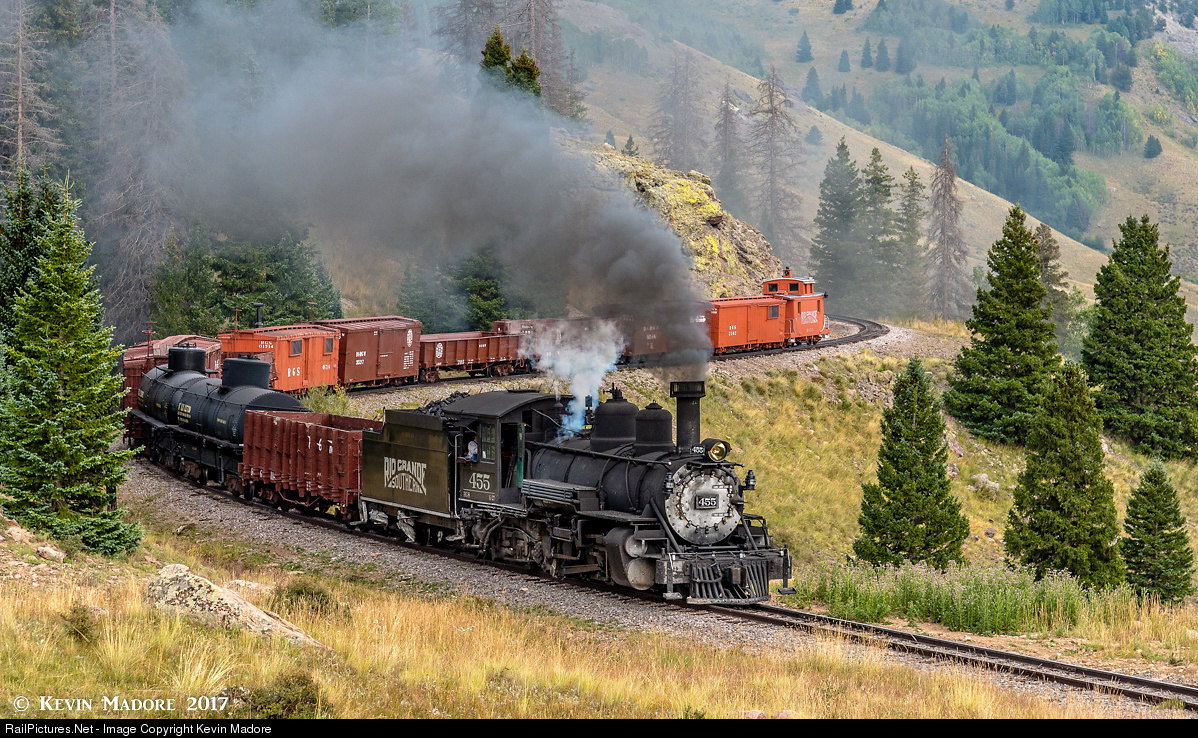 RGS 455 at Apache Canyon. RGS 455 (DRGW 463 in disguise) hauls her freight around the rock formation just east of Apache Canyon Crossing at about MP 327.75. This particular location and shooting angle are not normally optimal on a sunny afternoon, but on a cloudy day with softer light, its actually provides a much better perspective of the entire train than the more conventional, sunlit shot at the gravel road crossing.