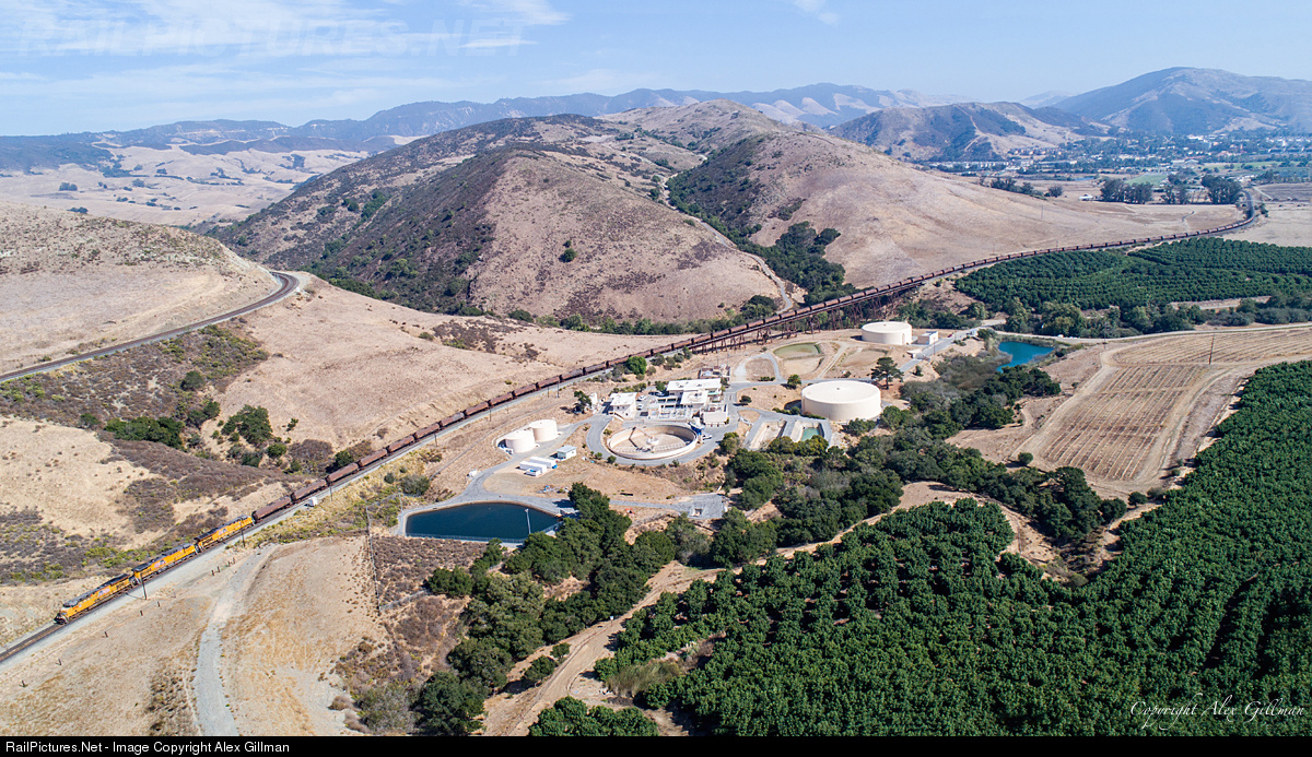 A Wye No More... Struggling upgrade toward the famous Gold Tree horseshoe curve while crossing over the 1894-built, 930-foot long Stenner Creek Trestle at the southern base of Cuesta Pass, UP 8094's 65-car train can be seen in its entirety as it heads north for a date with the Chorro siding. Once there (seen above the locomotives perched on the hillside), the ODOWP will coast to a stop on the grade to wait for a meet with the southbound Coast Starlight. Of special interest for those historians out there...the road bed curving away from the locomotives is actually what remains of the Gold Tree Wye they broke off the siding that was once here and had tracks running due west toward Camp San Luis Obispo. During World War II, this wye was used heavily moving troops to and from the grounds of the camp...and reportedly was one of the smallest CTC controlled sidings on the entire Southern Pacific system at 1,700 feet. The wye would go on to be used into the day's of the current Men's Colony facility before it was torn up.
