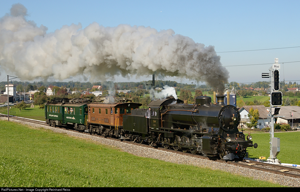 | The former Gotthard steamlocomotive C 5/6 2969 "Elephant" of Eurovapor makes a test run from Romanshorn to Wittenbach, just leaving Muolen on a grade of 18 ‰. |