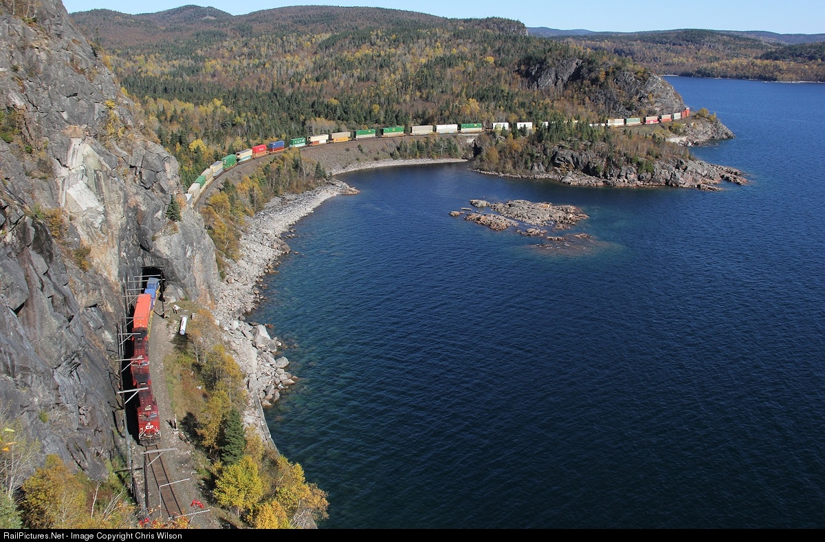 CP's flagship #101 intermodal train passes through Mink Tunnel on the North Shore of Lake Superior