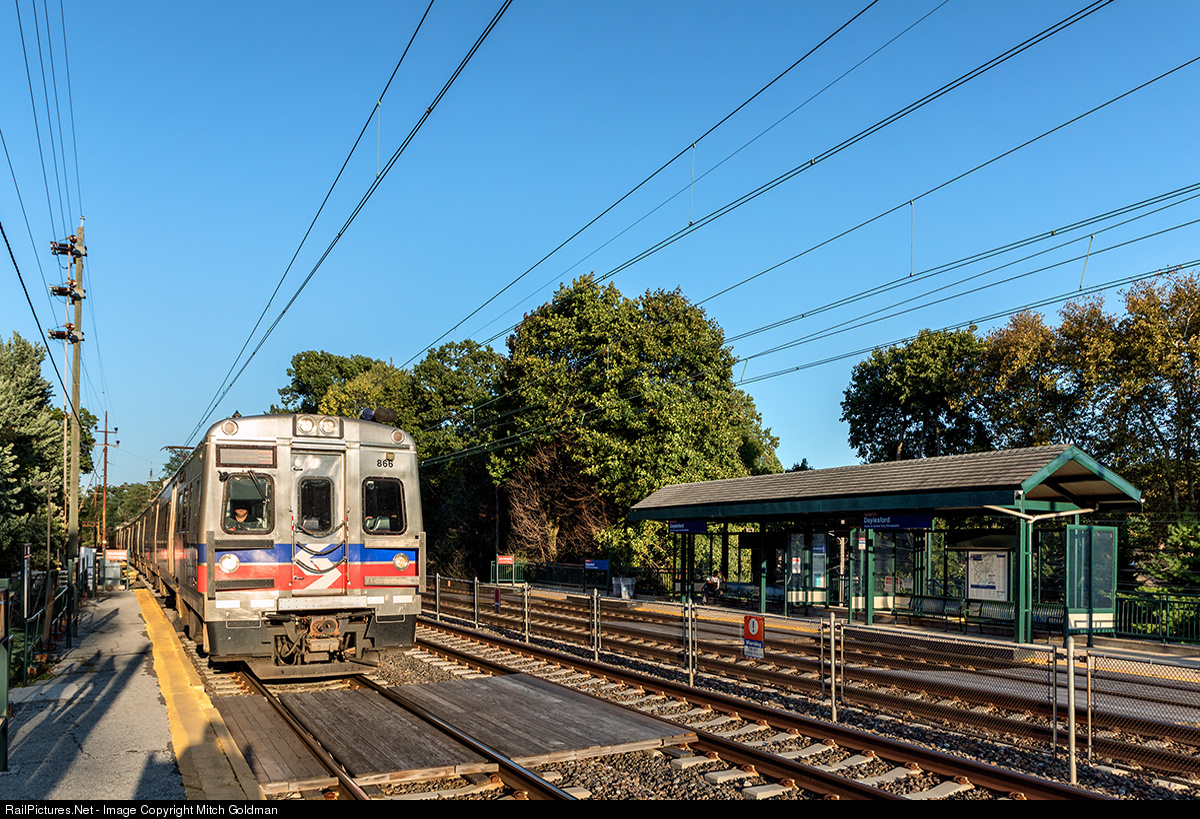 | A late evening westbound train made up of five Silverlineer V's makes a quick stop at Daylesford Station, located parallel to US 30 in Berwyn, PA. To see a photo from 1986 by J. Gilbert featuring the old shelter and Reading Blueliners (on the former PRR main) - click here.