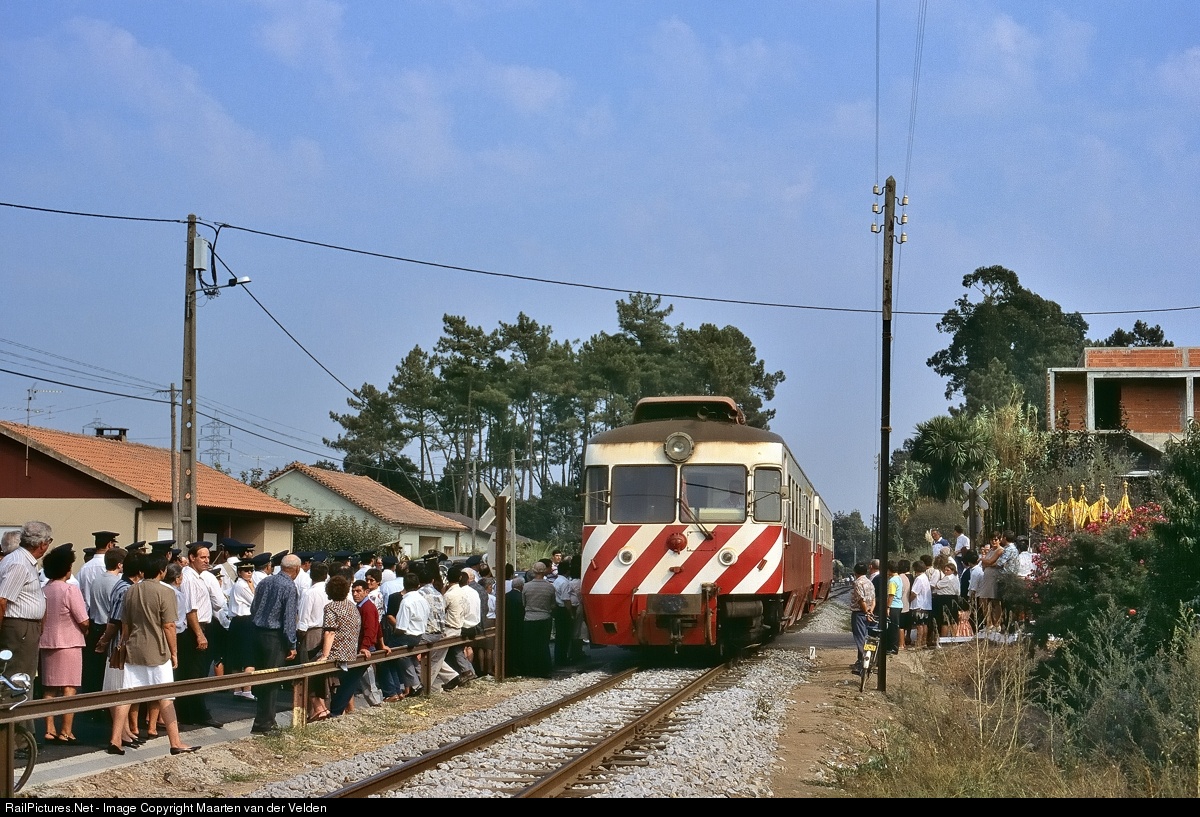 | Under loud horn signals a procession of the Catholic Church is disturbed and split up in two by the oncoming CP 9308 with trailer 28-29 307. The 9308 was on its way as Regional 5114 from Sernada do Vouga to Aveiro.
