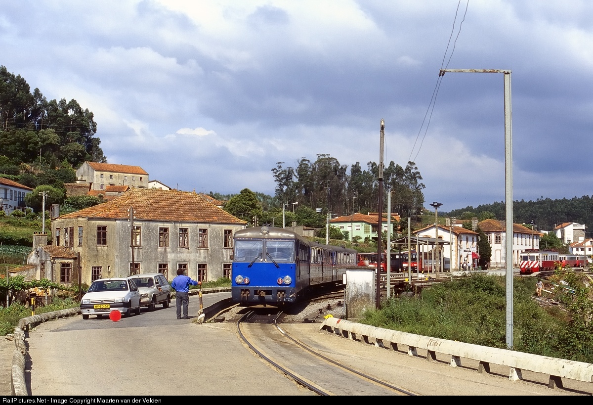 | The guardsman has closed the bridge over the Rio Vouga with a chain for all roadtraffic to allow CP 9402 the use of the bridge. CP 9402 was on its way as Regional 5114 from Sernada do Vouga to Aveiro. Right of the train the railway station of Sernada do Vouga with some Allans and busses of CP.