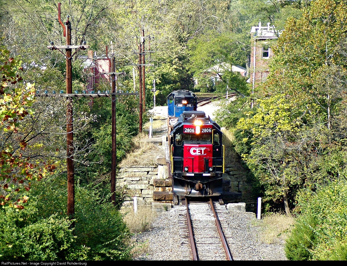 After pulling 2 cars of scrap from new customer Cohen Recycling in the town of Macon, the CCET's road local is crossing the East Fork of the Little Miami River in Williamsburg, seen here westbound with CCET 332 leading and CCET 2806 bringing up the rear with the train in "Pull-Pull" mode.