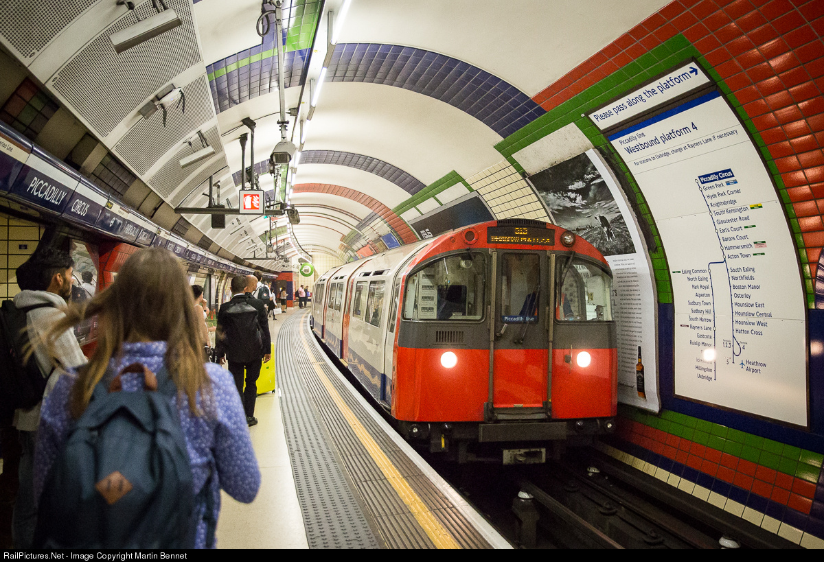 A Piccadilly Line train arrives at Piccadilly Circus in central London.