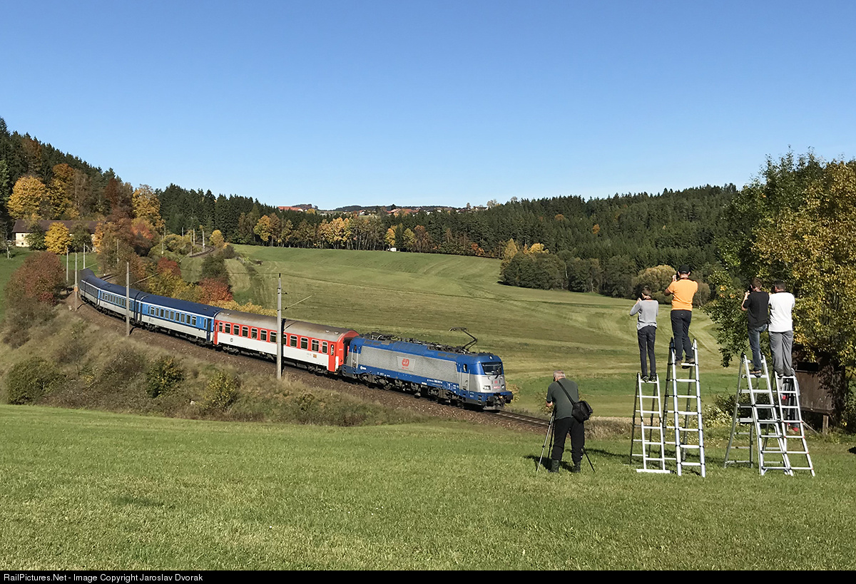| CZ / 196 Praha - Ceske Budejovice - Linz (Ex 1543 ANTON BRUCKNER). The beautiful weather has attracted many railway enthusiasts today. |