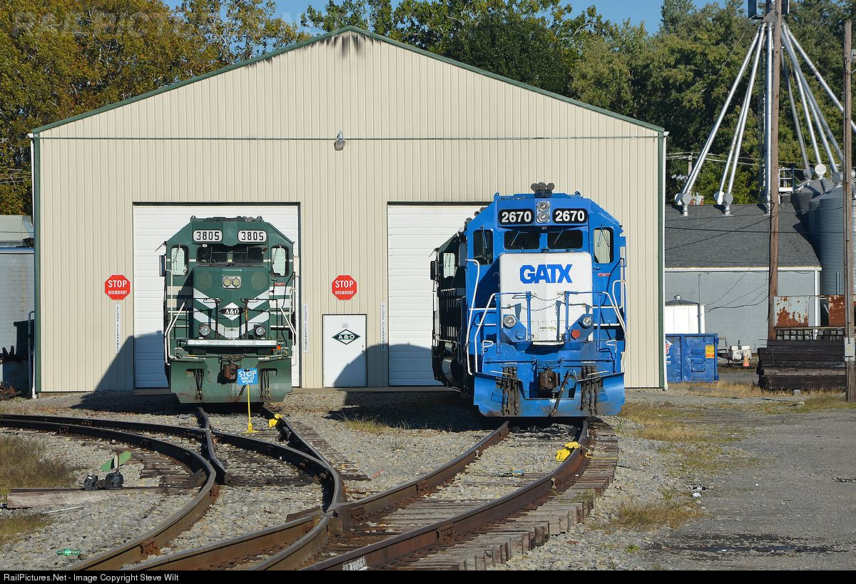 Appalachian and Ohio GP38-2 #3805 and GATX GP38-2 #2670 are seen at the A&O shops in Buckhannon, WV.
